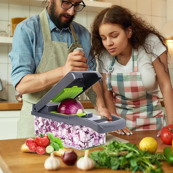 Vegetable Chopper,14 in 1 Multifunctional Food Chopper Pro Onion Mincer Kitchen Veggie Gadgets Slicer Dicer Cutter With 8 Blades & Strainer Basket,Carrot Potato Egg Slicer Cheese Grater With Container