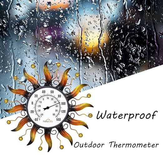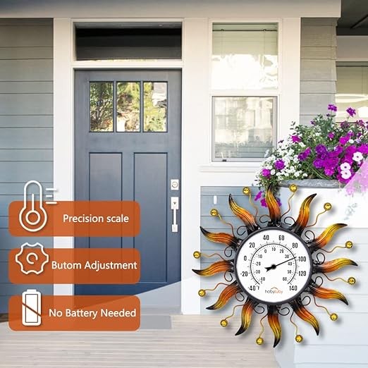 • 【Precision scale】Sun wall hanging thermometer can maintain accurate scale in any weather, and it provides -40 to 140℉ ranges (-40 to 60℃). This decorative outdoor thermometer is designed with bold black lettering and white background which is easy reading for a long distance. It's a great option to place indoors or outdoors.