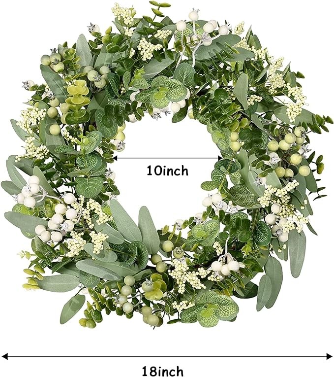 • 【Full and realistic】 Vlorart's handmade green eucalyptus wreath features eucalyptus leaves, boxwood, white/green berries, andmany small berries embellishedon it, making the wreath full, natural and realistic. Its elegance add a vibrant and pleasant vibe to your home.