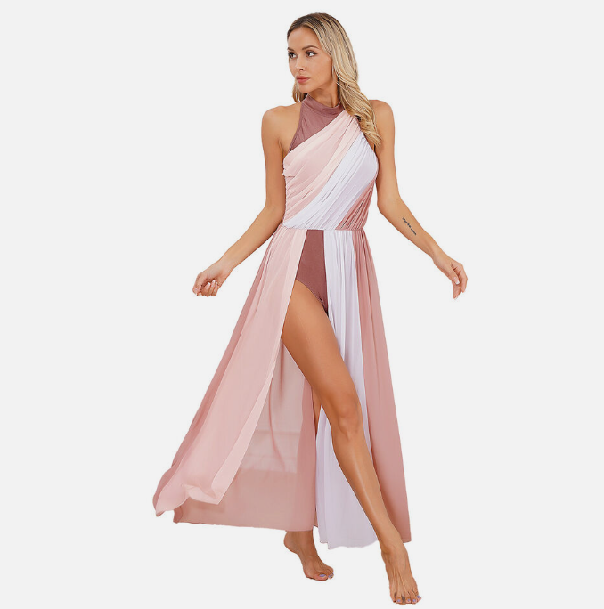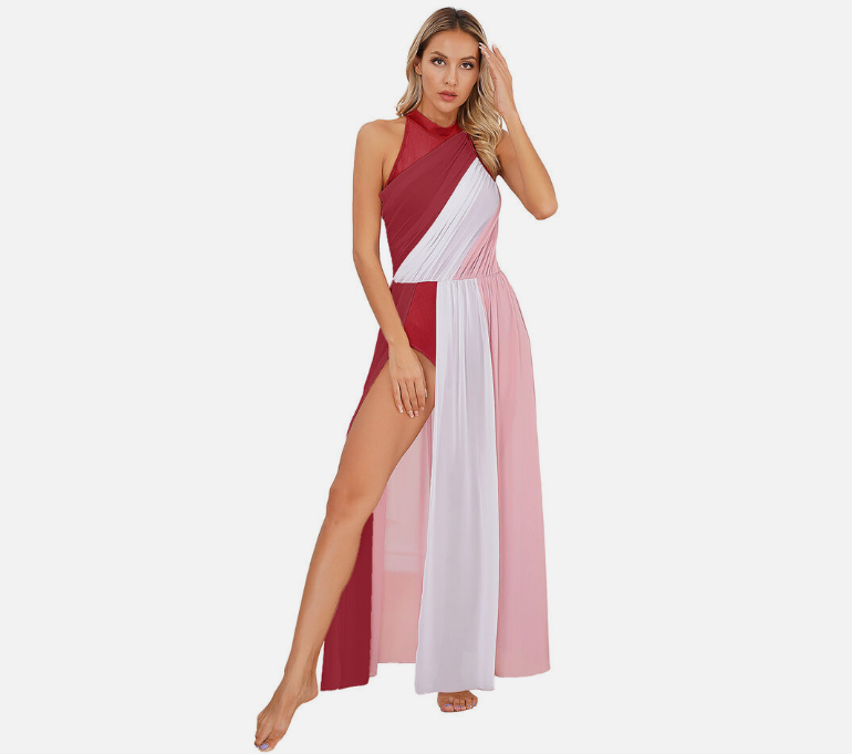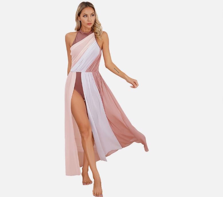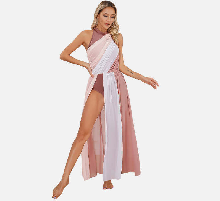 Sleeveless dance dress for women, color block design, bodice top with ruched chiffon overlay, unique and stylish.