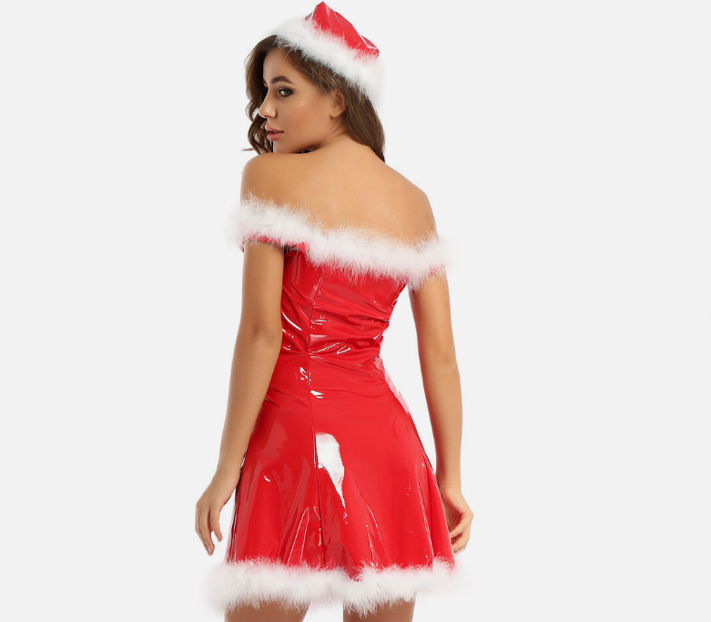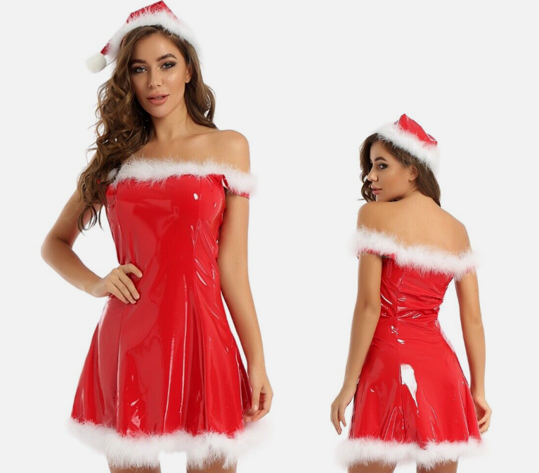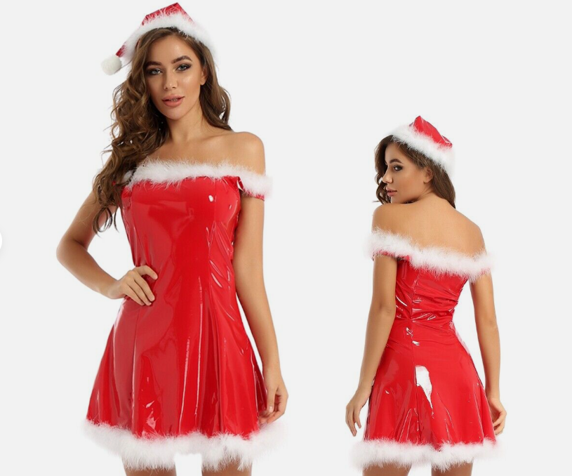 Women’s Christmas fancy dress Mrs Santa Claus Xmas party costume dress with hat, wet look appearance.