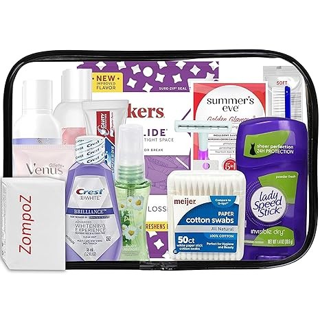 Womens Travel Toiletries Kit, Travel Bag of Hygiene Essentials for Bath, Shaving and Personal Care, 13 Mini TSA approved items in Reusable Zipper Bag with Bonus Zompo-Z Tissue Packet