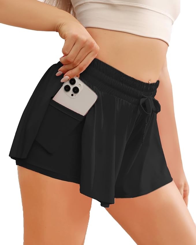 DESIGNS:2 in 1 casual butterfly shorts is high waisted,drawstring and double layer.It has stretchy spandex-ish underwear liner that does not rid up Inner lining that gives you more privacy and security.The biker shorts with a side pocket can keep your keys and mobile phone.
