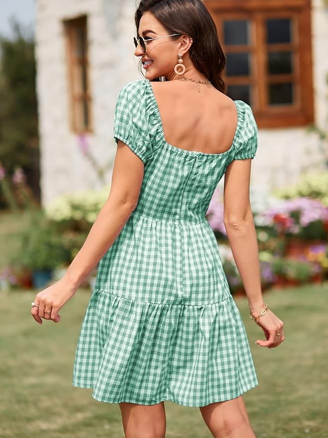 ▶Features:Womens casual mini dress with plaid pattern,crewneck ,short sleeve, cute puff sleeve,back zip up,flowy style,fashion above knee length summer short dress.