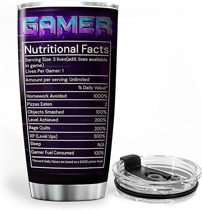 ZOXIX Gamer Coffee Tumbler Nutritional Facts Stainless Steel Mug With Lid 20oz Insulated Cup Vacuum Novelty Game Lovers Gifts Skull Mugs For Gamers Gaming Tumblers For Boys